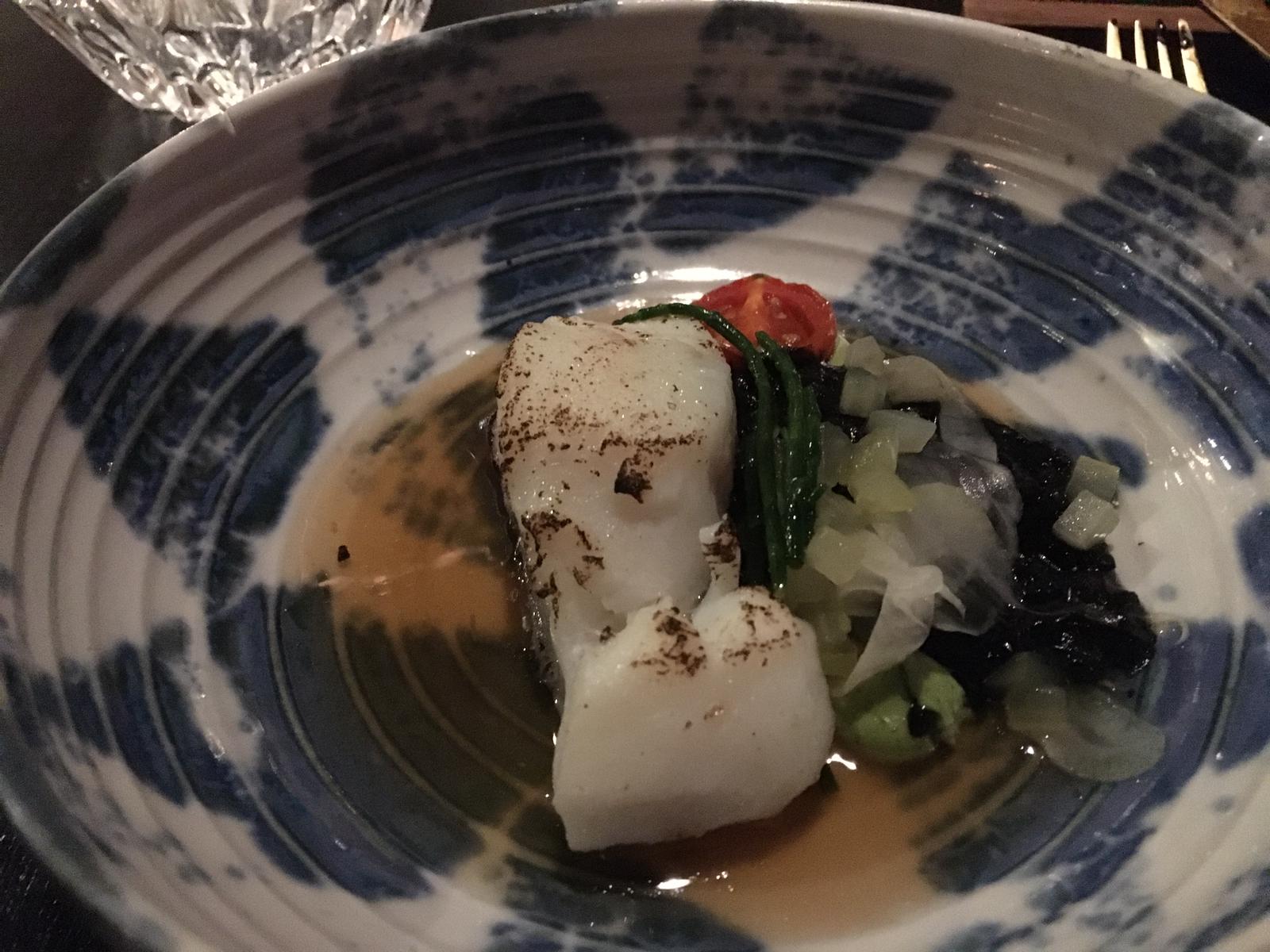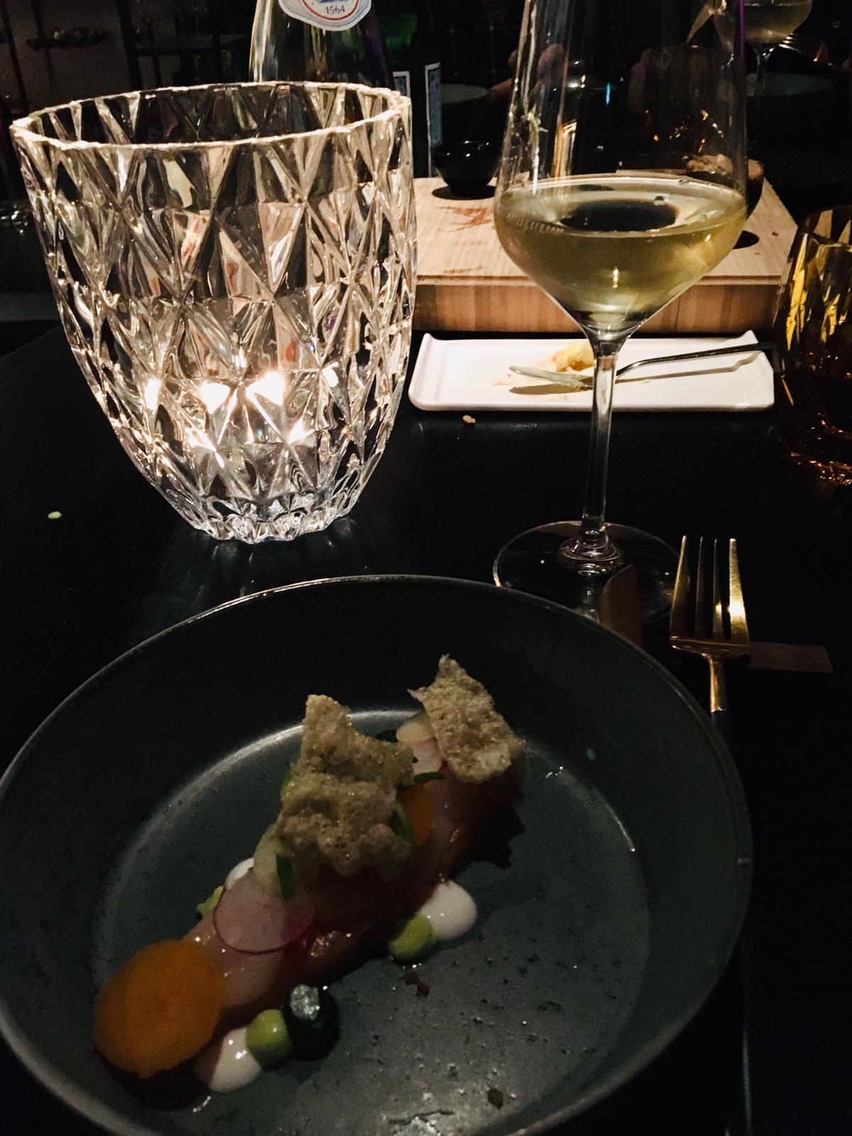 Al snel wordt het eerste gerecht gebracht en wordt de eerste wijn ingeschonken. De eigenaar is het niet helemaal eens met de timing van uitserveren en met een klein handgebaar staat heel de keuken in houding te wachten totdat hij klaar is met zijn betoog over de wijn. We hebben geen idee wat hij eigenlijk aan het vertellen is, maar het zal wel een mooi verhaal zijn over aardse smaken. Want door ervaring weten we ondertussen wel dat aardse smaken schijnbaar een kapstokbegrip is in de wijnwereld. Alles heeft aardse smaken. Geen idee wat aardse smaken nou precies zijn, maar het is een heerlijk wijntje.