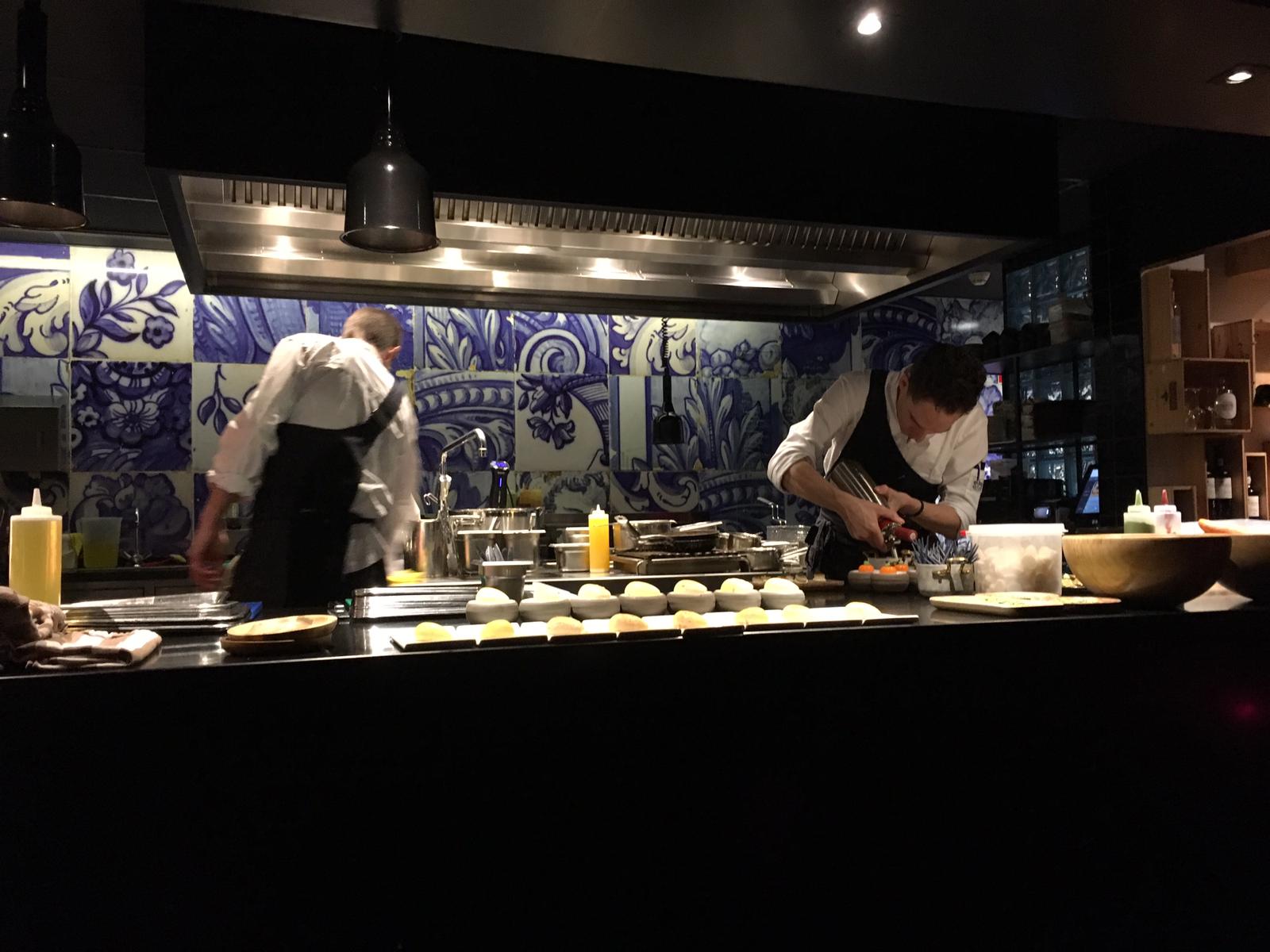 De menukaart wordt vrij snel verspreidt op onze tafel en gelukkig wordt er ook een broodplankje gebracht. Goede dikke plakken donker brood om onze honger alvast wat te stillen. De keuze is net als altijd niet heel erg moeilijk. Er wordt ook deze keer gekozen voor een viergangenmenu, met de gebruikelijke vier gangen wijn erbij. Het brood vindt snel de weg naar onze magen en de eerste platte praat begint over de tafel te komen. We zitten tegenover de keuken, dus we moeten onszelf een beetje inhouden om niet bij iedereen het schaamrood op de kaken te krijgen. Inhouden is niet iets waar we heel erg goed in zijn, maar we doen ons best.