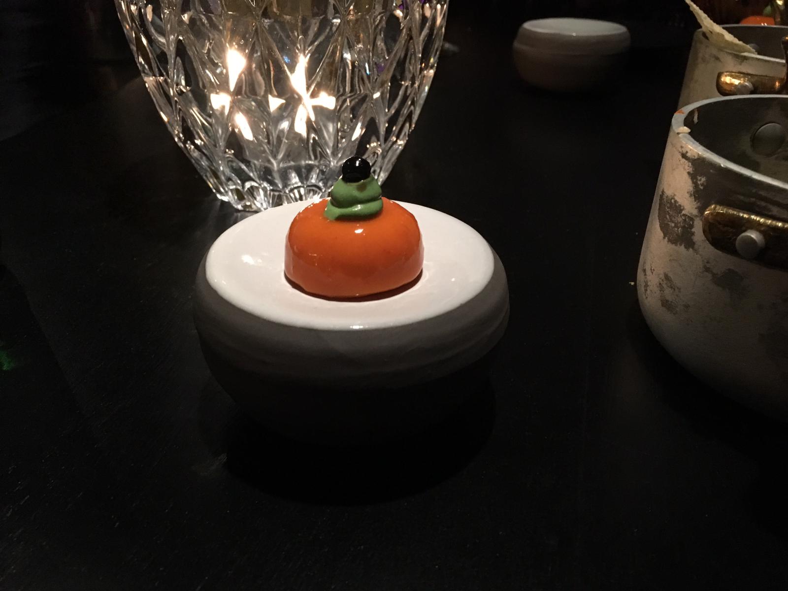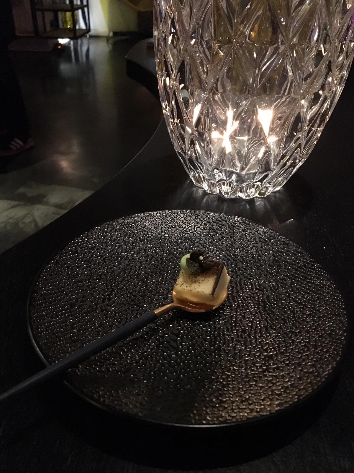 Voordat we los mogen gaan krijgen we nogmaals een amuse of smaakmaker. Deze keer worden we getrakteerd op macarons met een mouseje plus een klein vierkantje op een lepel. Niemand schonk op dit moment nog aandacht aan de ober. Dus je moet ons vergeven dat we geen idee meer hebben wat het nou precies is. Het trekt in ieder geval de lijn door van de vorige amuse. We zijn al weer snel stil en aan het genieten van deze een hapsmaaltijdjes.