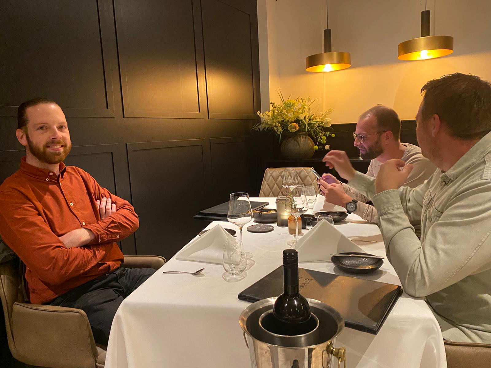 Wat we nog wel weten van de avond is dat Mike erg trots was dat hij zich opofferde en de hert afsloeg. En dat hij zeker een half uur zeer slechte grappen maakte met het woord "Hert" erin. Rik ging hier totaal niet in mee en boorde elke mogelijke opmerking van Mike direct de grond in. Rik heeft sowieso heel de avond alleen maar aandacht gehad voor een andere bepaalde gast. Hij was er zelfs dermate van onder de indruk dat het er tijdens de weg naar huis nog steeds over ging. De gangen volgen elkaar in een lekker tempo op, de flessen wijn gaan net iets sneller op. Nick krijgt het in zijn hoofd halverwege de avond dat hij perse rode wijn wil gaan drinken, de we laten de goddelijke witte wijn even staan voor een flesje rood. De kater die sommige de dag erna hebben wordt ook wel aan Nick en zijn rode wijn verweten. We moeten ook wel een beetje snel dooreten, want door de corona maatregelen moeten we ook om 22.00 uur uit het restaurant zijn.