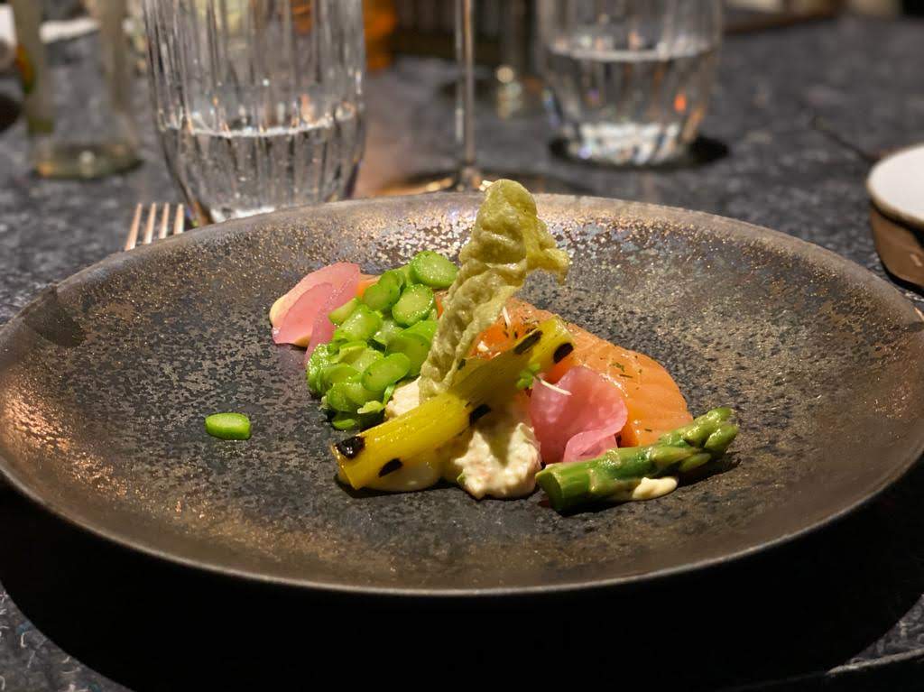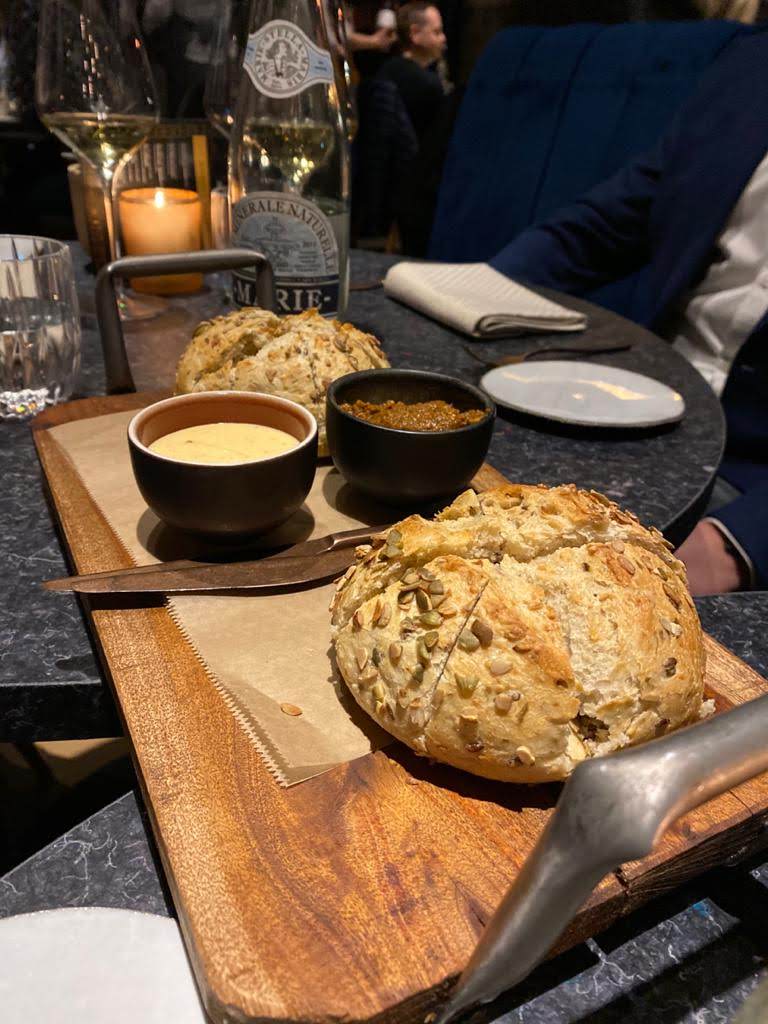 Bij binnenkomst wordt natuurlijk direct gevraagd of we onze jassen willen afgeven. Dit is voor niemand een probleem, alleen Nick moet er toch wel weer over nadenken. Want hij heeft een nieuwe jas, zo nieuw dat hij pas net uit de doos is gehaald. Nick zegt dit ook continue dus we moeten hem maar op zijn woord geloven. We worden direct langs de ingang aan een tweetal mooie tweed tafeltjes neergezet. Direct wordt er een amuse op tafel gezet en wordt er plaats gemaakt om een flesje wijn vooraf te drinken. We zitten in Eindhoven, want we krijgen voor de verandering weer eens een buitenlandse ober. We zijn na alle avonturen hier al een beetje op ingesteld en switchen zonder problemen voor de beste man over op het Engels. Het eten wordt alleen bezorgd door een uiterst mooie vrouwelijke bedienden. Gelukkig zitten we langs de keuken en kunnen we onze ogen goede kost geven. Want daar zijn we toch ook wel een beetje voor gekomen. Het doet met zekerheid niet onder aan de ervaring van FIFTH.