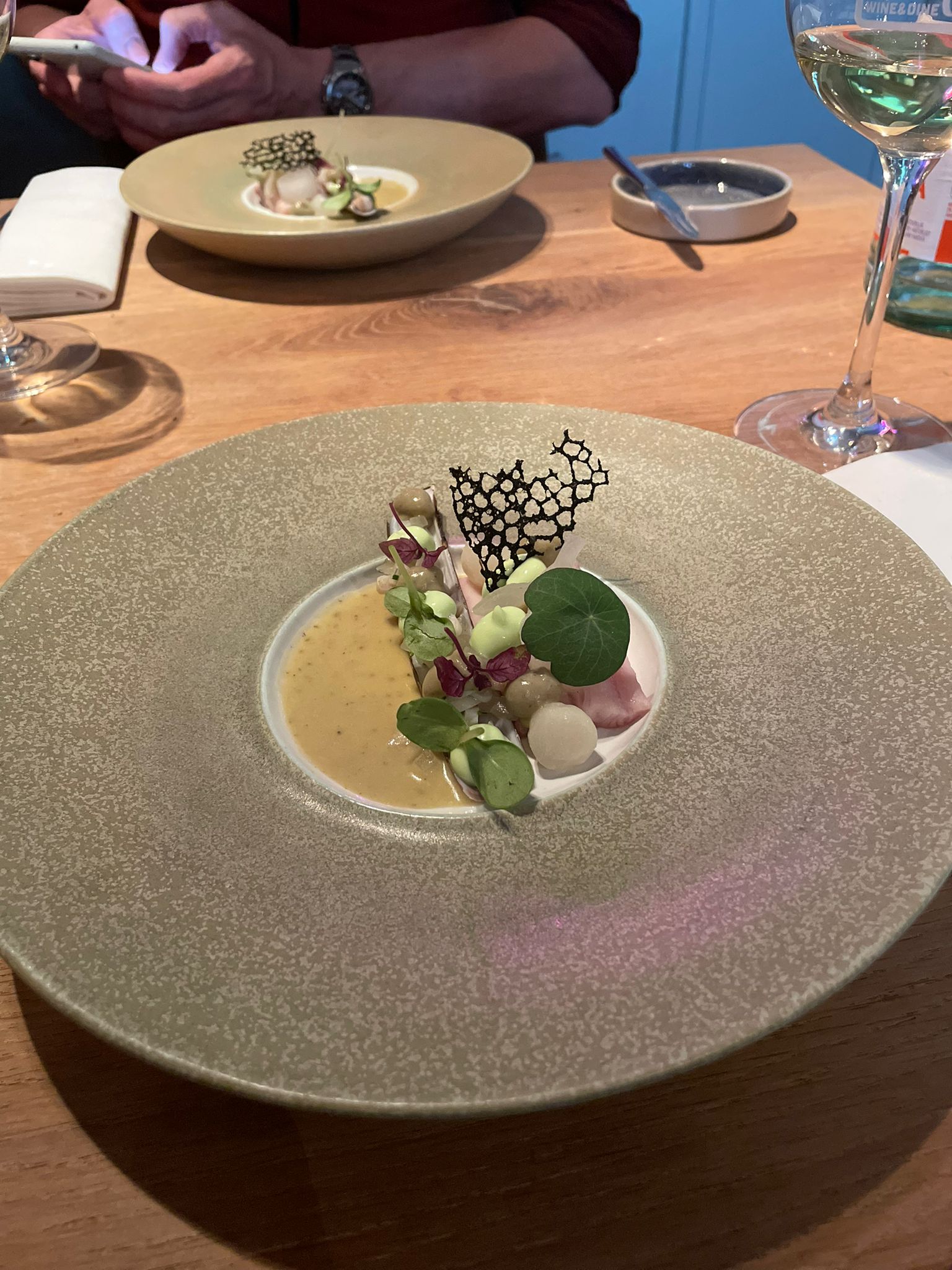 De eerste gang werd vergezeld door een Grillo wijn uit Sicilië, een frisse en aromatische keuze. De sommelier sprak met superlatieven over deze wijn, benadrukkend de unieke eigenschappen van de Grillo druif, die groeit op de vulkanische gronden van Sicilië, beïnvloed door het zeeklimaat. De wijn rijpt op stalen vaten, wat bijdraagt aan zijn frisse en minerale karakter. Het gerecht zelf was een ware ontdekkingstocht van smaken, met zeewier, waterkers en andere delicatesse gepresenteerd op een scheermes. De contrasten in textuur en smaak zorgden voor een boeiende culinaire ervaring.