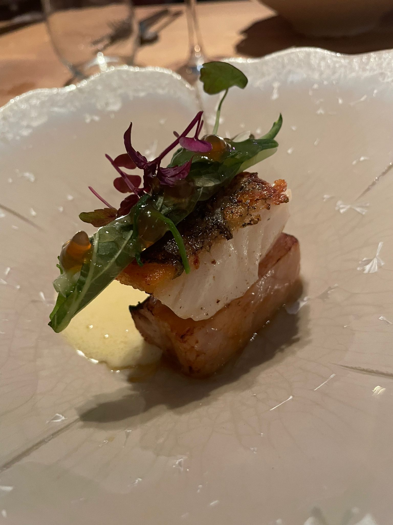 Het hoofdgerecht was een sublieme combinatie van schelvis en mals buikspek, vergezeld van granaatappel, waterspinazie en een rijke ponchosaus. Deze derde gang was een hoogtepunt van de avond, met een perfecte balans van smaken en texturen. De opvolgende sommelier, die blijkbaar klaar was met zijn bardienst bij de opnames van First Dates, sprak in superlatieven over de wijn, wat hij sterk neerzette maar onbedoeld onderuitschoffelde door het veelvuldige gebruikt van het woord 'misschien'. Desalniettemin was sfeer van het restaurant geweldig, mede door het gebrek aan goedhechtend stucwerk en gebrek aan fotowaardige verlichting. Dat maakte de beleving nog intenser.