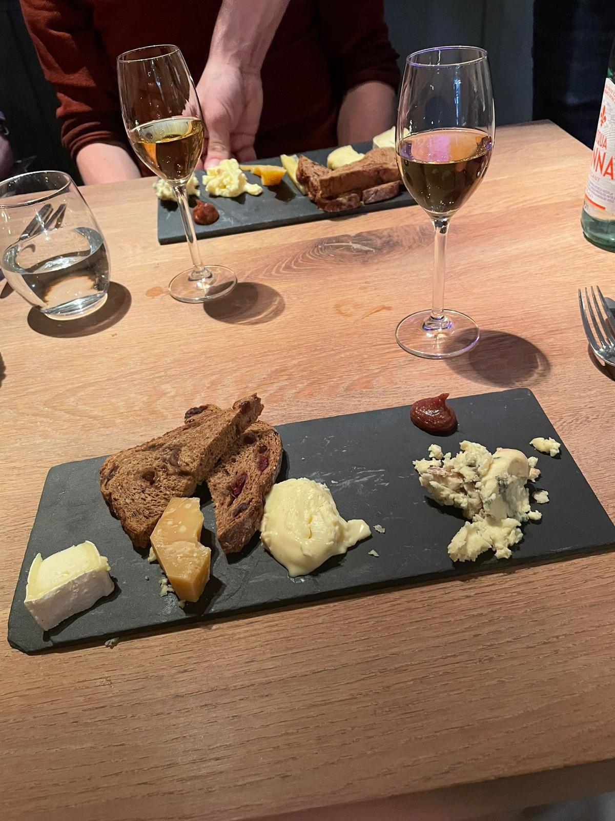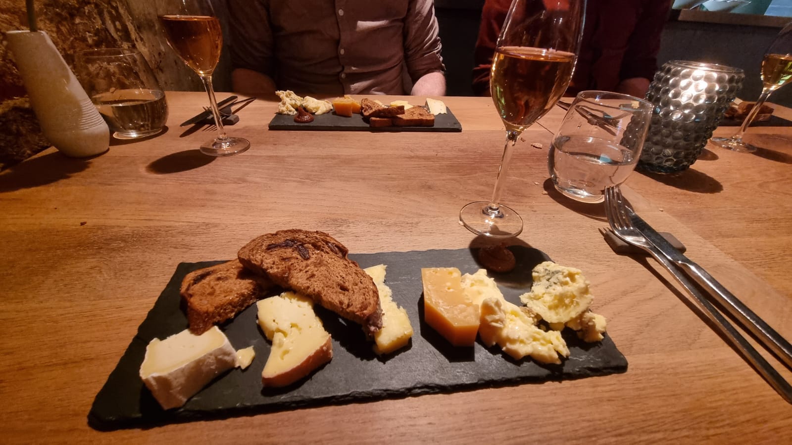 In plaats van een zoet dessert, sloten de heren af met een kaasplank. Zes verschillende kazen - minus twee voor Nick die zal ontkennen een beetje in zijn mond te hebben overgeven bij de vooraankondiging van de blauwaderkaas - prachtig op een houten plank geserveerd, waaronder inderdaad blauwader en gorgonzola, maar ook een harde Brabantse kaas. Dit werd begeleid door een Pineau de Charentes, een wijn met een sterke cognac geur, wat een verrassende en aangename twist was op de traditionele port, de Ruby and Tawny. De kaarsverlichte gewelven gaven deze afsluiting een extra vleugje charme. De sommelier lichtte de keuze van de Pineau de Charentes toe, prijzend de rijke aroma's en de perfecte balans tussen misschien wel zoet en sterk.