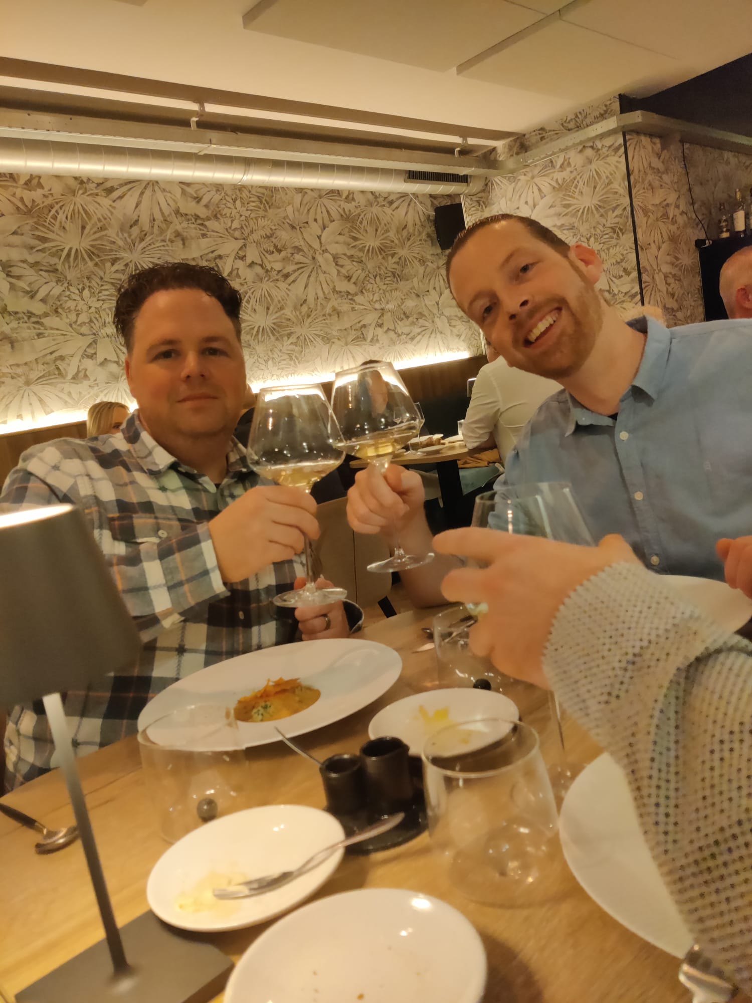 En net als zoals verwacht hebben we genoten van echt geweldig eten. Door de volle glazen met wijn die we kregen van de sommelier is het geheugen een beetje wazig, maar wat we wel weten is dat het lang geleden is geweest dat we zo'n culinaire avond gehad hebben. Goyvaerts heeft misschien nog geen ster, echter met dit niveau zal het niet lang meer duren. Wat ook niet lang op zich liet wachten is baldadige Rik. Hij komt er al snel achter dat het sfeerlampje op tafel in sterkte is aan te passen. En natuurlijk maakt hij er weer een volledige disco van. Fel, zacht, hard of uit, het lampje begint onder zijn aanvoering weer heerlijk te flikkeren.