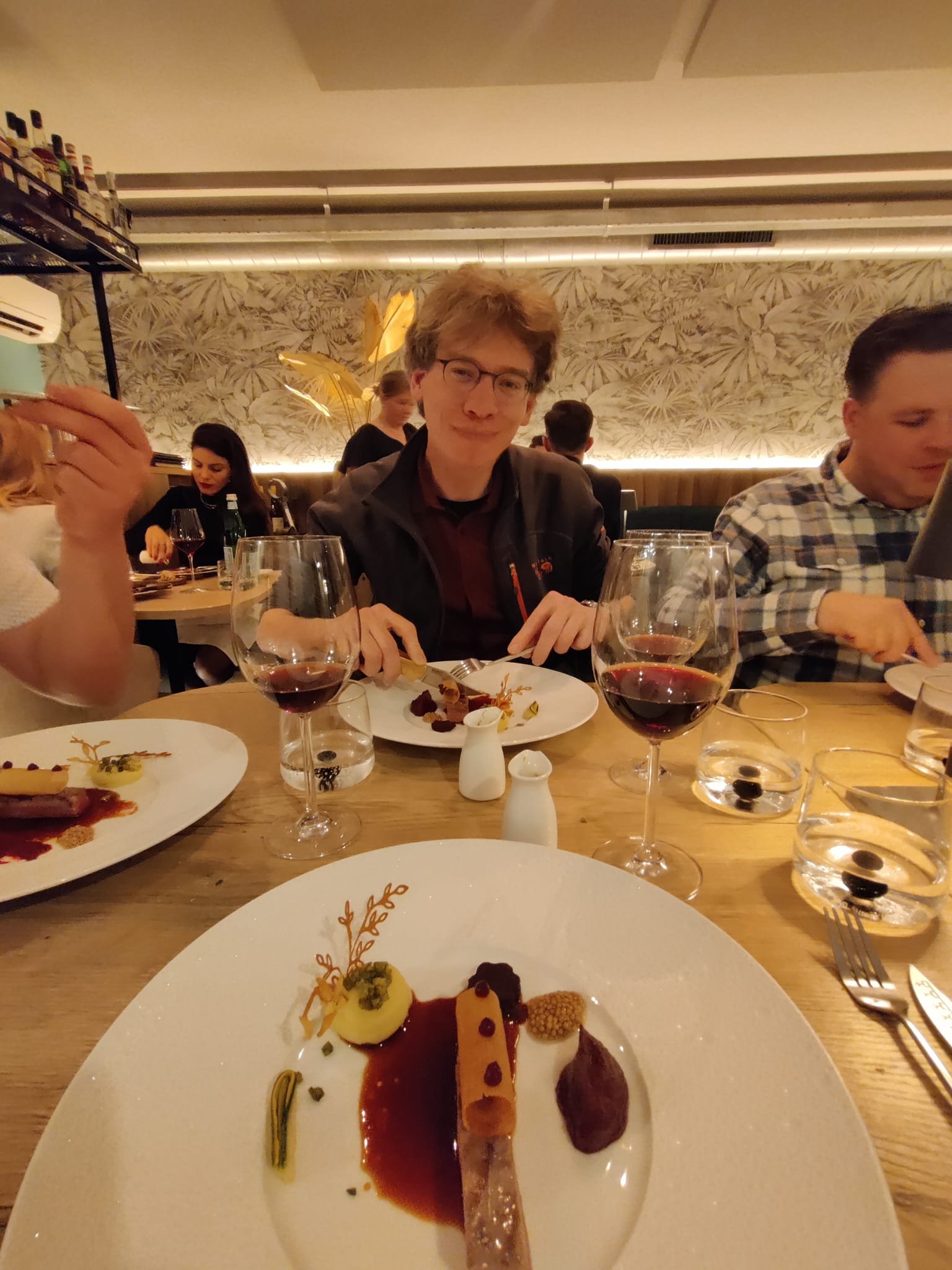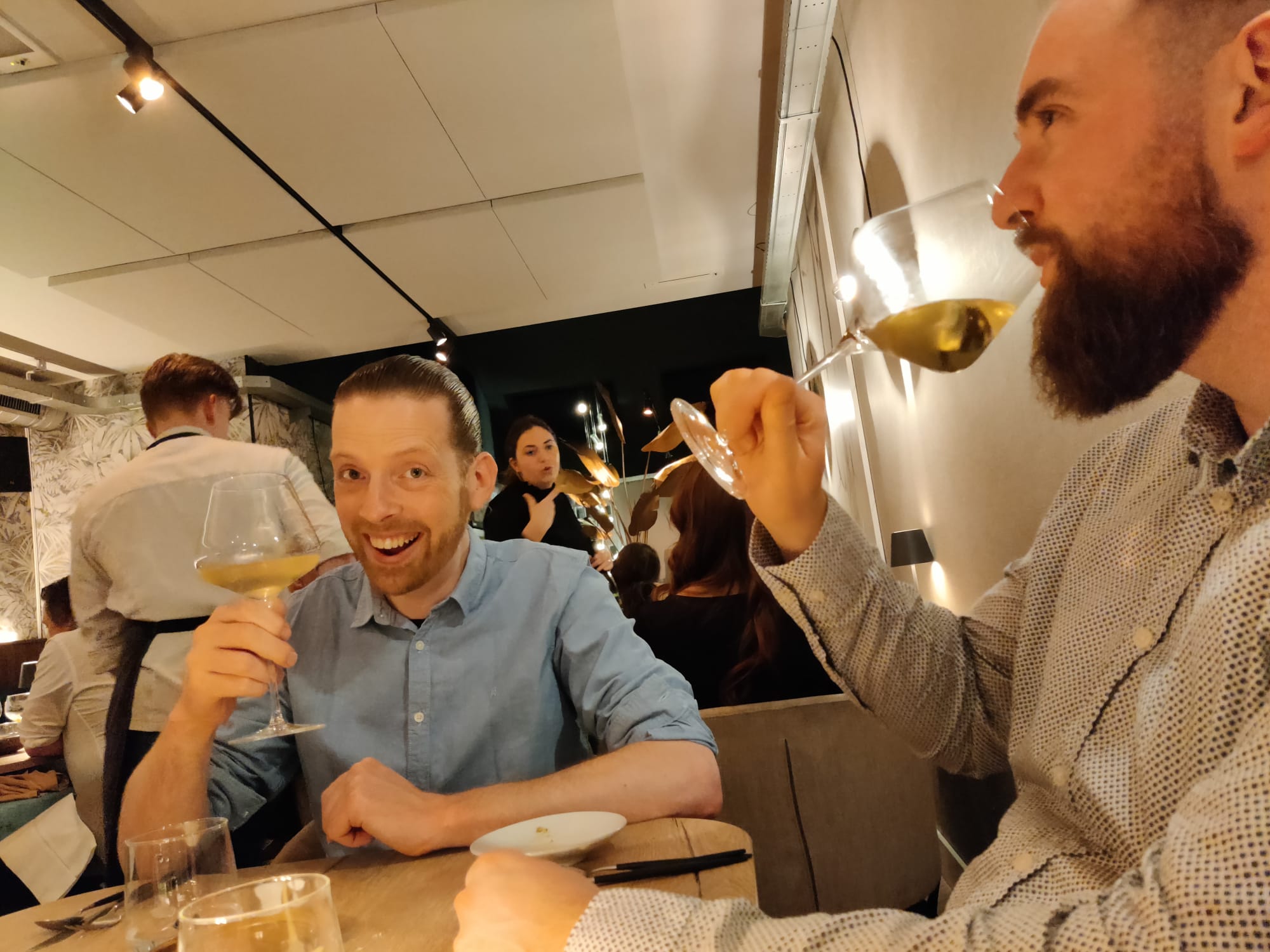 Na de champagne en amuse hebben we ook eindelijk de tijd om even te aarden in het restaurant. Blij dat we zijn dat we weer mogen vanavond en allen hebben we er ook echt zin in. Zin in een avond met heerlijk eten en betere wijnen. Al snel komen we erachter dat we een nieuwe sommelier hebben vandaag. Er komen hele verhalen bij de wijnen tevoorschijn, maar zodra er een vraag gesteld wordt is ze helemaal de weg kwijt. Beste manier om weer op de weg te beginnen is heel het verhaal opnieuw te vertellen. Alsof je de stekker uit een computer trekt en even wat seconden wacht om hem weer op te starten. Zo worden hele IT problemen in de wereld opgelost en zo gaat onze sommelier er ook mee om. Maar we kunnen er om lachen en we hebben de tijd vanavond. Al snel zitten we heerlijk te genieten van de wijn en om ons heen te kijken. Dion komt er al snel achter dat er 1 stel waarschijnlijk ruzie heeft of iemand van het koppel last heeft van het resting bitch syndroom. Want ze kijkt echt heel erg vies heel de avond. Mike heeft al snel oog voor het andere schoon in het restaurant en geeft zijn ogen weer ouderwets de kost.