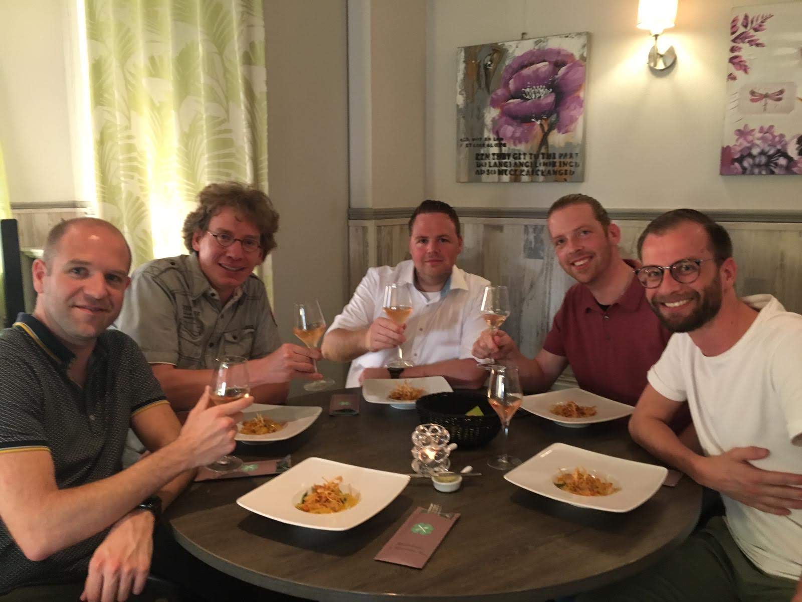 Keuze in het menu hebben we vandaag alleen niet. Erik heeft al exact doorgegeven aan de chef waar we van houden. Dus we mogen niet spieken op een kaart om vervolgens toch een 5 gangen menu van de chef te bestellen. Dit is allemaal al voor ons gedaan. Zelden zijn we allemaal in zo’n gespreid bedje aangekomen dus we zijn wel een beetje onder de indruk van de voorbereiding van Erik. De wijn wordt samen met de eerste gang inschonken en we worden verrast met een heerlijke rode wijn. Mike heeft zich al snel voorgenomen om heel de avond bij elke wijn te vragen naar aardse tonen. Dus hij dringt zich lekker op en gaat telkens een dialoog aan over de tonen van de wijn. Niemand vindt dit leuk behalve Mike, maar hij is gelukkig tevreden met zichzelf. De wijn wordt vergezeld met een heerlijke carpaccio. Tim is er niet eens bij vandaag en toch eten we carpaccio. We merken al snel dat de wijn zijn werk aan het doen is, want we worden mondiger. Aangezien we nog steeds de enige gasten zijn in het restaurant levert dit niet direct een probleem op. We kunnen ongegeneerd alles bespreken, zonder ook maar iemand tot last te zijn. Zo’n privé restaurant bevalt ons wel, al snel wordt geopperd om voortaan standaard heel het restaurant af te huren. Maar de kosten hiervoor zullen misschien wel een probleem worden.