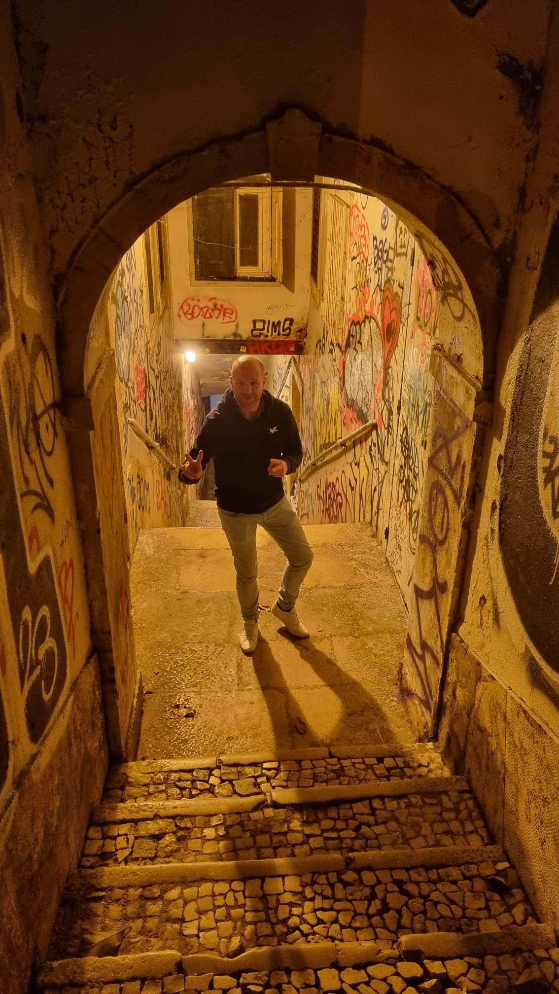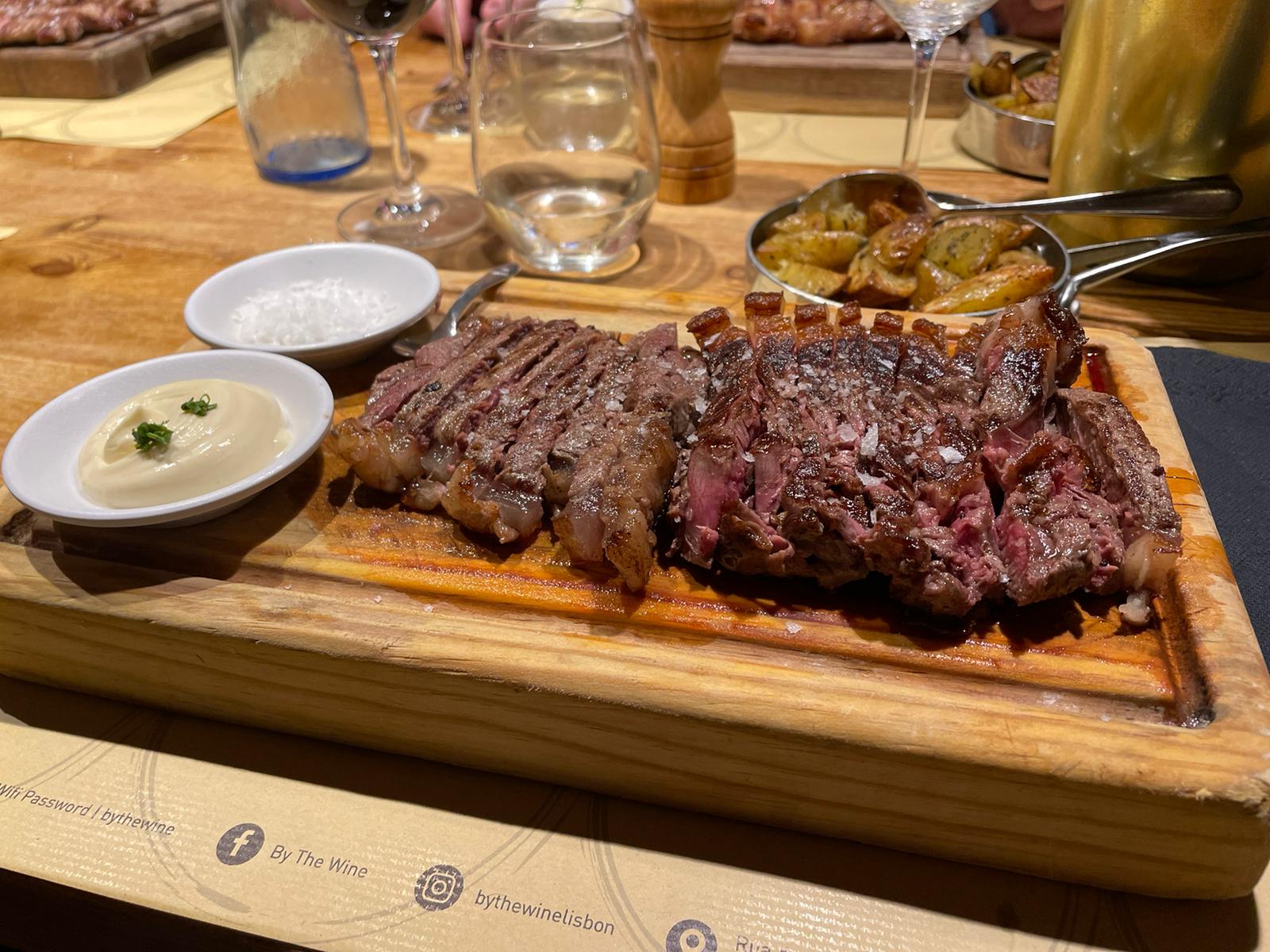 We zijn natuurlijk in Portugal het land van Christiano Ronaldo, de tweede Ronaldo, dus we kunnen het niet tegengaan dat er tijdens het eten soms een SIUUUU klinkt om aan onze Portugese medemensen te laten horen dat we aan het genieten zijn. Na het voorgerecht volgen er nog meer heerlijke hoofdgerechten, steaks in verschillende soorten en maten vinden de weg naar onze tafel. Met meerdere flessen wijn aangevuld natuurlijk. We zitten zo al even heerlijk te genieten dat we niet door hebben dat Dion al even is verdwenen. We weten tot de dag van vandaag niet wat er heeft plaats gevonden op de gender neutrale wc, maar we vermoeden een flink slagveld. Maar hij kwam met een fantastische glimlach van de wc vandaan dus het zal wel een flinke opluchting voor hem zijn geweest. Na het eten is het natuurlijk tijd voor een toetje. Maar het toetje moet even wachten omdat Tim eerst nog even een glas wijn moet laten vallen. Kan natuurlijk de beste overkomen, maar we willen niet zeggen dat zijn alcoholconsumptie er iets mee te maken heeft. Hij is alleen erg onrustig en luid aanwezig. Na het toetje zitten we nog even te twijfelen om nog een fles wijn open te breken. Lang kunnen we echter niet twijfelen, omdat Tim al buiten staat en ons aan het aansporen is om uit te gaan. We gaan dus niet rustig de avond opstarten, maar gewoon maar meteen uit in Lissabon.