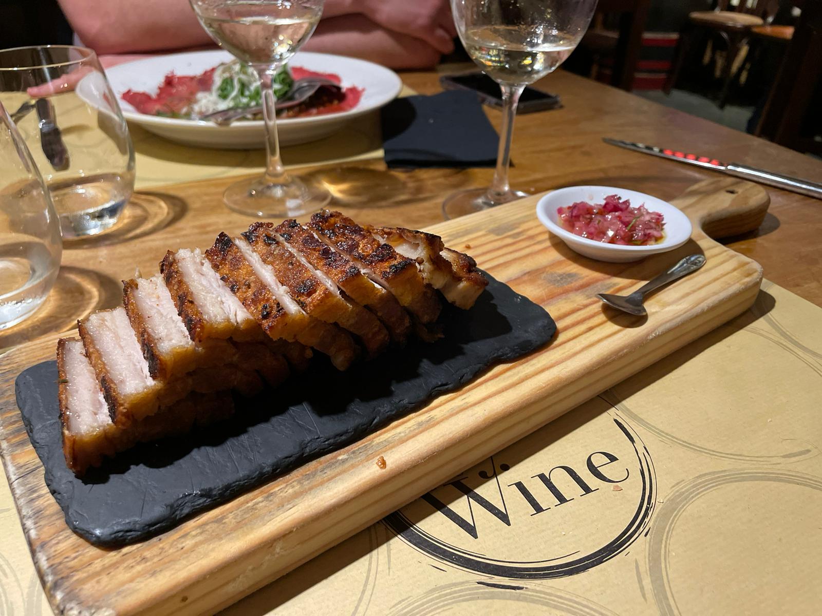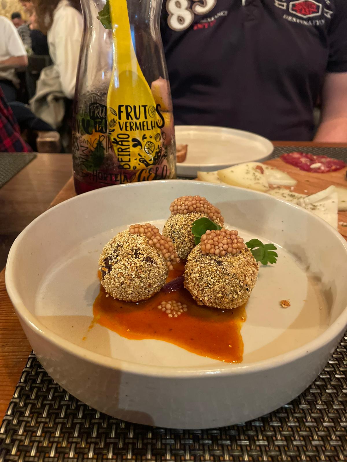 De korte zoektocht naar een restaurant wordt echter nogal een zoektocht. Doordat iedereen andere eisen heeft aan het eten wordt het even zoeken naar een geschikt restaurant. Eentje met veel vis en toch vlees, tapas en toch a la carte, lokaal maar toch groot. Je kent het wel, Nederlanders met hun specifieke eisen. Maar na een kleine rondtocht door Lissabon vinden we eindelijk een klein geschikt restaurant. Er wordt voor ons een tafel gemaakt en direct worden we hartelijk welkom geheten. Het heeft even een paar uur geduurd maar nu is het tijd om ons helemaal onder te dompelen in de lokale cuisine van Lissabon. Al snel hebben ze in het restaurant door met wat voor gezelschap ze te maken hebben aangezien er direct een lading drank wordt besteld. Een karaf witte Sangria, een karaf normale sangria en een fles rode wijn. We zijn gesetteld en zitten we helemaal in ons ritme. De drank gaat sneller op dan dat de ober ons kan bijhouden en na een rondje drinken volgen de eerste gerechten op tafel. Als voorgerecht hebben we gewoon de gehele kaart besteld en er komt een mix aan gerechten op onze tafel. De geroosterde chorizo worst was een absolute topper. De Portugese bitterballen met kaviaar waren ook een vreemde maar heerlijke gewaarwording.