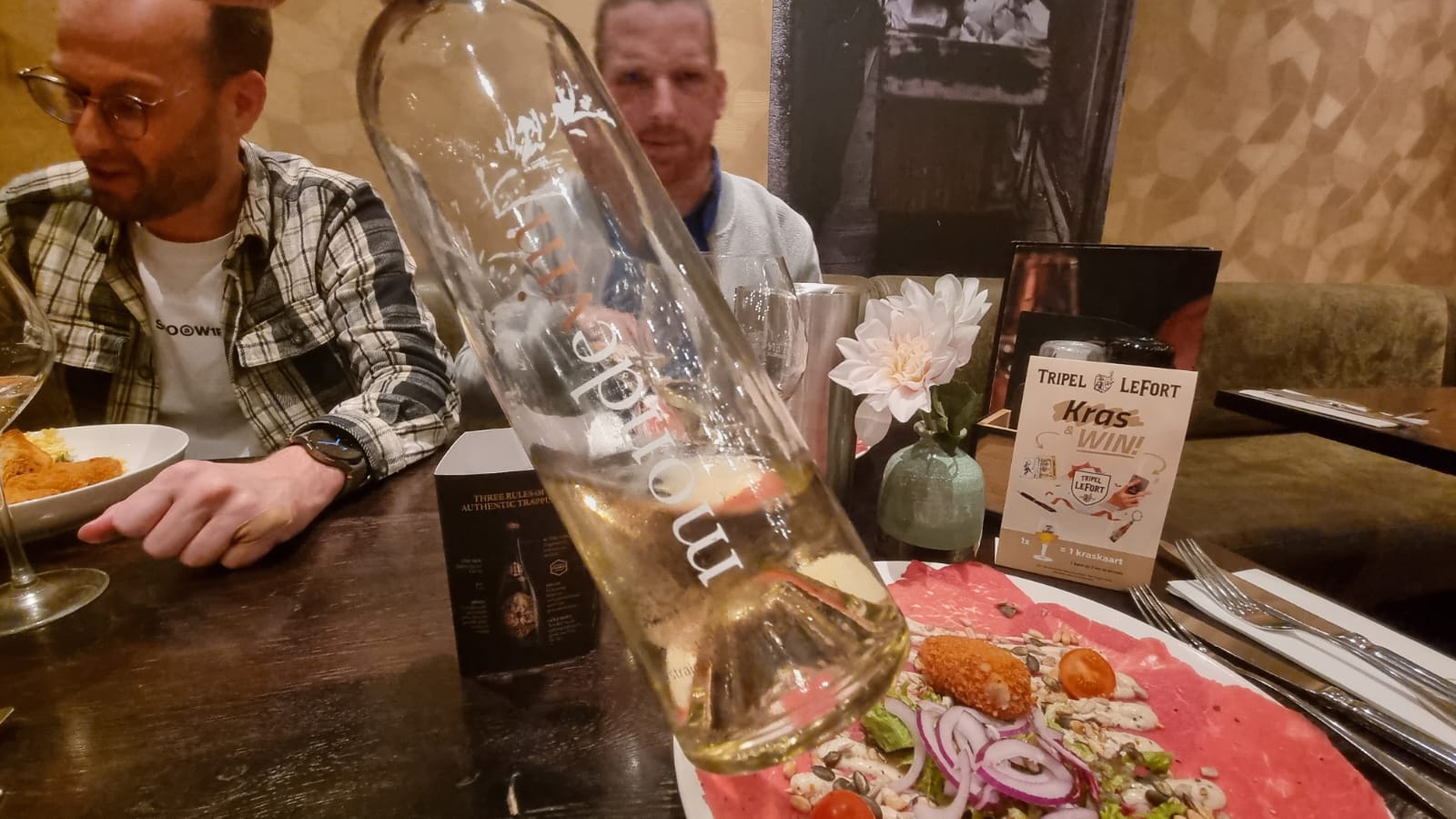 Na enig stoeien met de plaatselijke gebruiken, lukt het uiteindelijk een flesje vino en menukaarten te bemachtigen. We nemen bij het eerste onder andere Carpaccio Surf en truffel, hoewel er ook Thais red curry kroketjes voorbij komen. Afijn, er komt rood vlees onder de neus door.